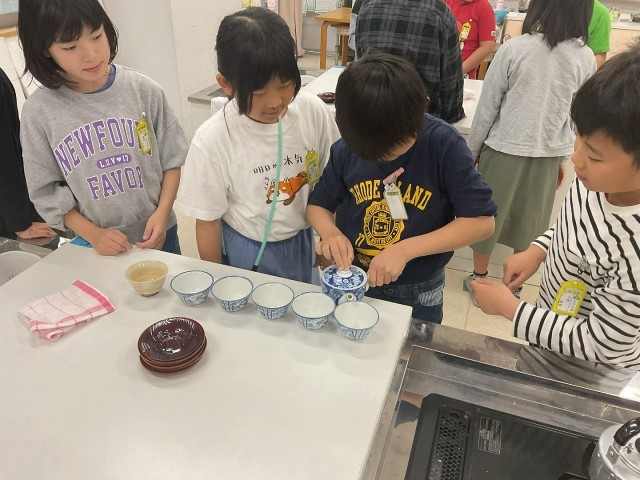 5年生は初めての調理実習を行いました。5年生の自分たちが生活をする中で、できることを増やそう!ということで、今回はお茶のいれ方をみんなで学習し実践しました。やかんを火にかけ、お茶の葉が入った急須にお湯を注ぎ、しばらく待って蒸らしてから、並べた湯のみに順番に注ぐといった手順を一つ一つ確認しながら取り組みました。何気ないことのようですが、子どもたちはドキドキしながら班の友達と協力しながらお茶を入れようとする姿が見られました。お茶を飲み始めるとちょっと苦いけれども、やっぱり自分たちでいれたものは一味違うみたいで、嬉しそうにいただいていました。どんどん自分でできることを増やしていけるといいですね。