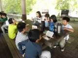 いよいよキャンプファイヤーです。 司会の進行のもと、「キャンプだホイ」を元気な声...