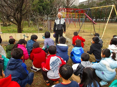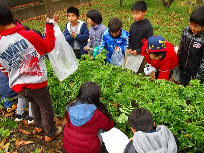 寒空の下,今回も地域の先輩にお世話になり,青首大根の収穫に行きました。子どもたちは,大根の葉っぱが大きく育っているのを見て,