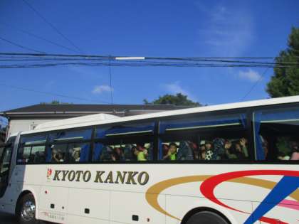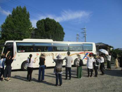 バスの中から笑顔で手を振り,