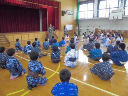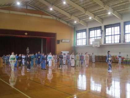 全員が浴衣の着付けをしてもらい,正座やお辞儀の仕方,立ち座りやすり足などの所作を体験しました。