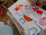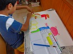 パスで線を書いた後,絵の具を使いました。絵の具を久しぶりに使ったため,最初はドキドキしている様子でしたが,集中して書くことが出来ました。ピンク色は赤と白,緑は青と黄色,紫は赤と青を混ぜると作れることを知った子どもたちは,嬉しそうに2色の絵の具を混ぜて作りたい色を作っていました。絵を書き終わる頃には絵の具マスターがたくさんいました。