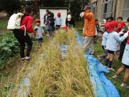 はじめは中々力が入らない様子でしたが,徐々に慣れた手つきで稲を刈れるようになりました。幼稚園の先生方の協力もあり,稲をきれいに干すこともできました。