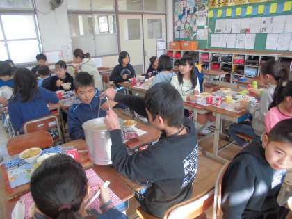 5年生3人と6年生1人か2人のグループで給食を囲みました。