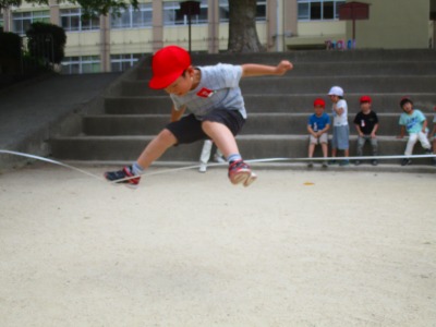 「ゴムとび」では,助走をつけて・・・ぴょーん!と元気よくゴムを跳ぶ姿が見られました。段々と高さが上がっていく中,子どもたちは跳び方を自分なりに工夫しながら,意気揚々と挑戦していました。