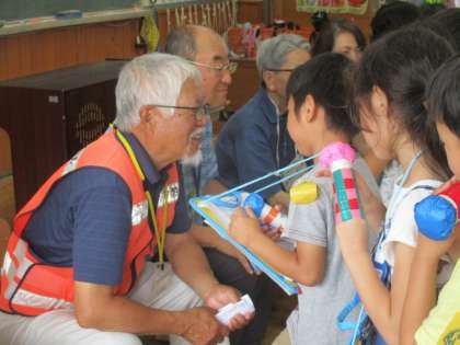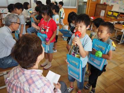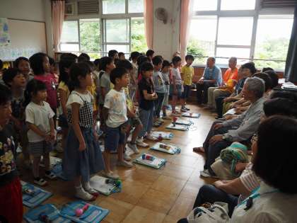 生活科「なかよしいっぱいだいさくせん」の学習で,これまで子ども達は,校内の先生や学級の友達になかよしじゃんけんやインタビューを行い,「なかよし」を増やしてきました。今回は,地域の先輩と見守り隊の方にお越しいただき,インタビューを行いました。初めはメモしたことを聞いていましたが,メモ以外の質問やお話をたくさんすることができました。インタビュー終了の時刻になると,「もっとお話ししたい!」と,なかよしがより深まったのが伝わってきました。インタビュー後には,地域の先輩と見守り隊の方と一緒に「たなばたさま」を歌いました。