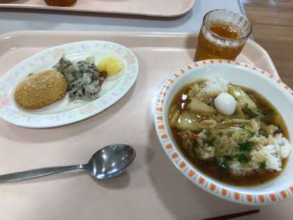 中華丼・コロッケ・キャベツとしめじのゆかり和え,