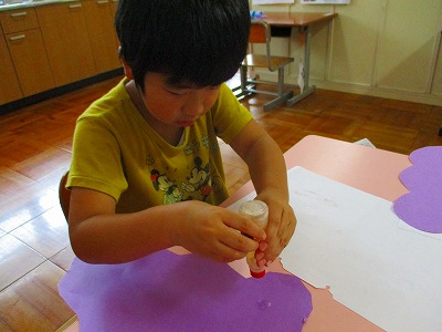 こすもす学級では9月の掲示作りをしました。今回は秋の味覚のぶどうです。輪っかをぶどうの実に見立てて色画用紙に貼り付け,たくさんのおいしそうなぶどうが出来上がりました。ぜひ,こすもす学級の廊下を通った際は見て下さいね。