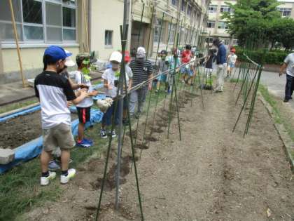 きゅうりの茎は折れやすいので子どもたちは慎重に植えていました。