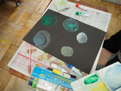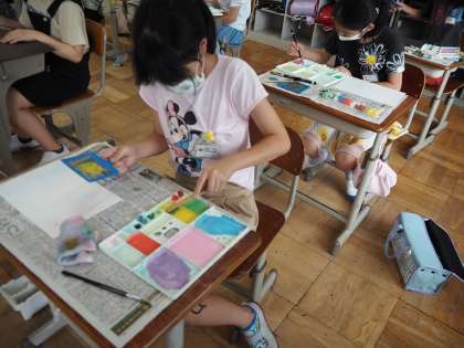 今日は,図画工作科の学習「心のもよう」をしました。絵の具で,今まで学習した技法をふり返って,好きな模様を自由に画用紙に描きました。筆にたっぷり水を含ませて,淡い色合いを楽しんだり,点々やしまもようなど,様々な形を楽しんだりと子どもたちはそれぞれに思い思いの表現を楽しんでいました。次の学習では,今日作ったものをもとに,好きな形に切ったり,組み合わせたりして心のもようを作っていきます。みんなそれぞれどんな模様になるのか,完成がとても楽しみです。