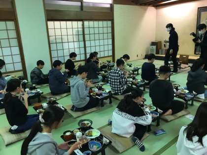 ひとりずつのお膳でいただきます。となり,前後は距離をとって,給食をいただくときと同じように座ります。
