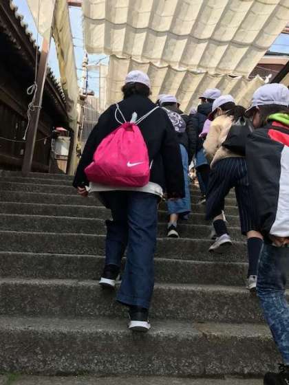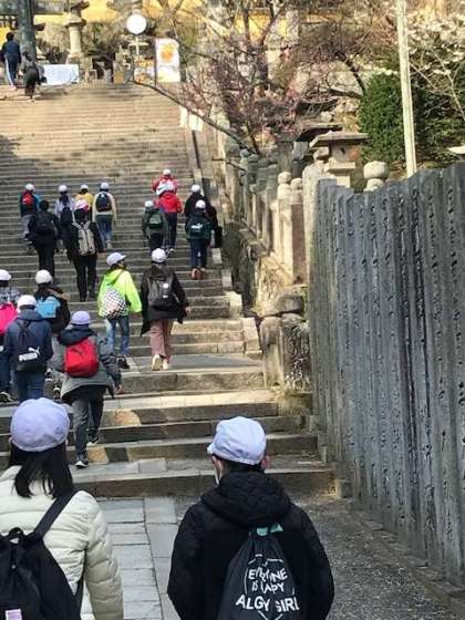 琴平中野うどん学校でのうどん作りを終えて,こんぴらさんにのぼります。