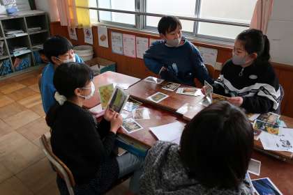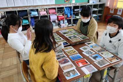 アートカード(絵画や彫刻,建築物など様々な芸術作品の写真が載っているカード)を使って鑑賞をしました。様々な方法で鑑賞をしました。例えば,「やさしい感じ」のするカードを選ぼうというテーマでカードを一人一人選び,なぜそのカードの作品が「やさしい感じ」がするのかを友達に説明しました。色や材料,形など様々な観点で選び,同じ「やさしい感じ」というキーワードでもそれぞれ全く違うカードを選んでおり,その違いを楽しんでいました。子どもたちは様々な作品の良さに触れ,とても楽しそうにゲームを楽しんでいました。