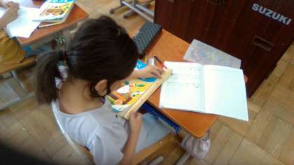 竹尺を使って自分の体や持ち物の長さを測りました。「筆箱は28cmだったよ!」「消しゴムの長さは2cm4mmだった!」などと言って,測った長さをノートに記録していました。