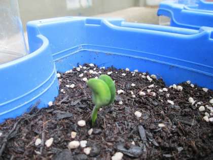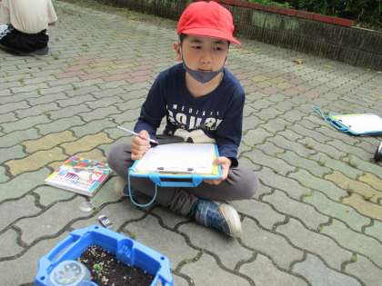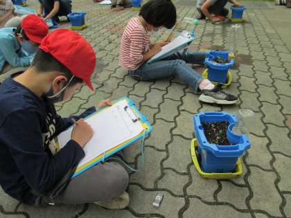 3年生の理科の交流授業で,大豆の観察をしました。1週間前に蒔いた種がもう発芽して,4cmの高さに成長していました。