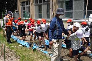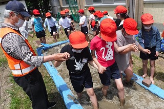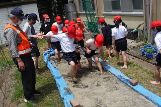 水の入った田んぼの中を,子どもたちは歩いていき,足で土を柔らかくしました。上手に田んぼの中を歩くコツを教えていただき,ゆっくりゆっくり進みました。はじめと最後では,土の柔らかさが違いました。苗のためのふかふかの田んぼができたと,子どもたちは大喜びでした。