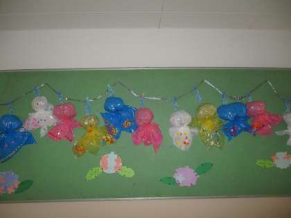 今日はこの前作っていたてるてるぼうずに口を描いたり,アジサイの花びらや葉っぱを作ったりしました。