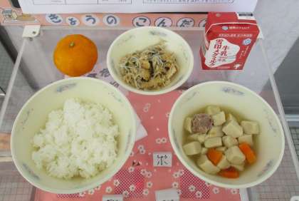 明日の給食は「肉じゃが」です。みんな大好き,カレー味の肉じゃがですよ。お楽しみに!