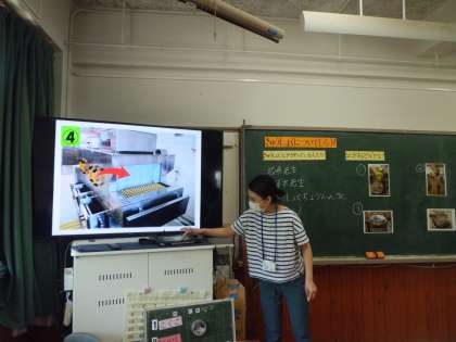 栄養教諭の先生に給食室にある機械のことや調理員さんのお仕事について教えてもらいました。写真を見て何をするための道具なのかを考えたり,友だちと話し合ったりしました。また,動画で,実際に機械を動かしている様子や調理員さんが働いている様子を見ました。