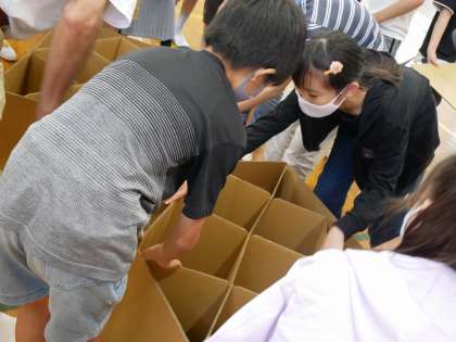 避難所で実際に使う,ダンボールベッドも実際に組み立てて寝てみたり,担架を組み立てて運んでみる体験もさせていただきました。
