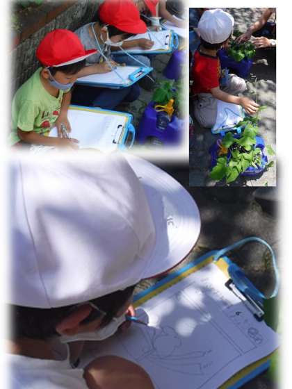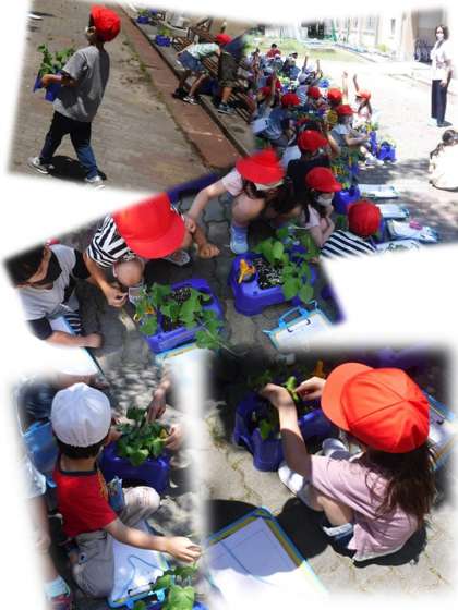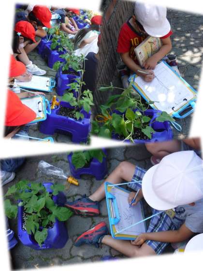 生活科の時間に朝顔の観察をしました。毎朝一生懸命お水をあげて,間引きをしました。葉っぱは何枚になったのかな。「1,2,3,4……」「お花みたいになってる。」早くもつぼみができているようです。お花が咲くまであと少しですね。登校して,お水をあげるときに見つけられるんでしょうね。楽しみですね。