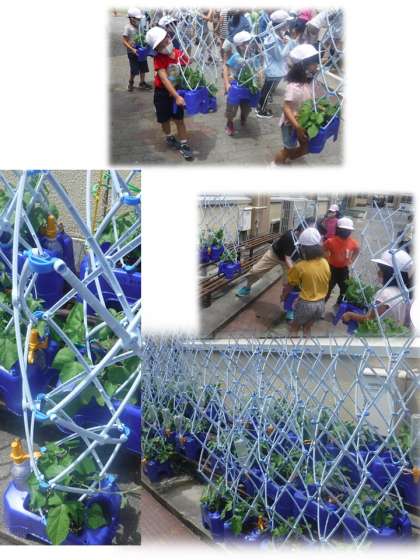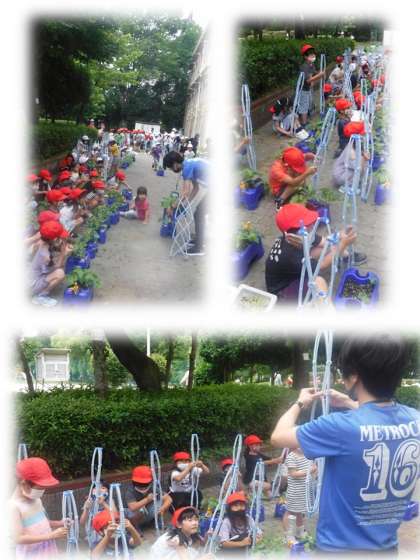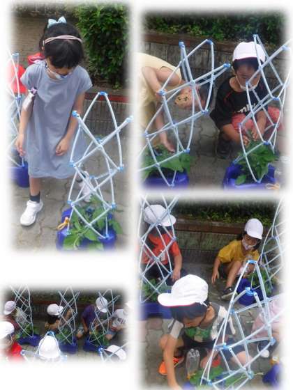 朝顔が大きくなってきました。もっと大きくなってもらうために今日は,支柱を立てました。つながった支柱を植木鉢の3つの穴に突き刺します。これが難しい。友だちと協力して早く終わらせている児童もいます。「はっぱは 中に入れなくていいの?」ときいていました。大丈夫。立ててから優しく入れましょう。