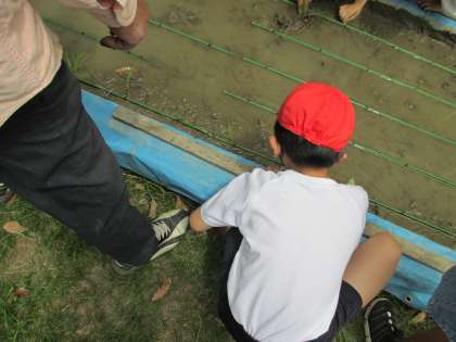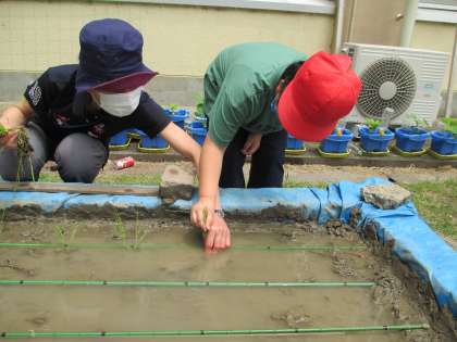 3年生の交流授業で田植えをしました。地域の方々のご指導のもと,先週代かきをした学校の田んぼに,赤米の苗を植えました。柔らかい苗を土にまっすぐ植えるのは難しかったのですが,頑張りました。