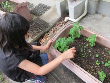 【こすもす学級】ミニトマトに添え木をしました