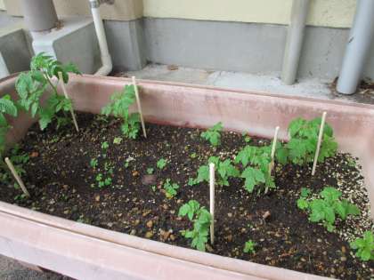 種から育ててきたミニトマトが大分大きくなったので,添え木をしました。割りばしを茎に沿うように土に立て,その茎と割りばしとをひもでくくりました。これで強い風が吹いてもしばらくは安心です。