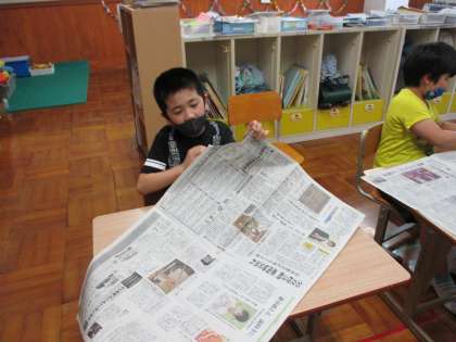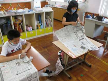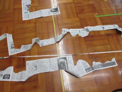 山階小学校はゲーム担当になりました。考えたゲームは「やぶってつなげよう!しんぶんビリビリゲーム」です。30秒間で新聞紙を細く長くちぎり,上位4人の新聞をつなげて結果が1番長い学校が勝ちです。