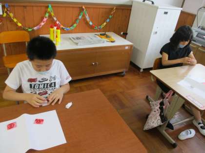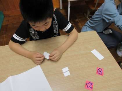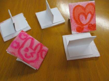 図画工作の時間に,先日のスタンプづくりの続きをしました。今日は画用紙を折って持ち手にし,ボンドでスタンプの裏に取り付けました。これでスタンプが押しやすくなりました。素敵なスタンプの出来上がりです!