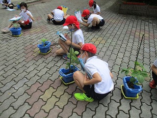 ダイズを植えた子は,支柱も立てました。子どもたちは,「前より,すごく大きくなっている〜。」と生長を感じながら,観察カードに記録していました。
