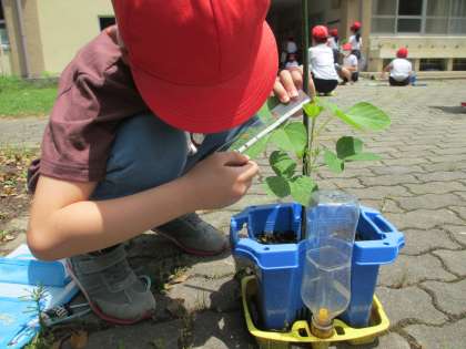 こすもす学級の児童が育てている大豆も元気に育っています。今日は支柱を立てました。その後大豆の葉や茎の様子を観察し,カードに記入しました。