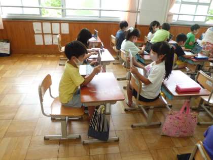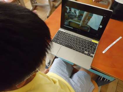 自分でパソコンを起動したりシャットダウンをしたりすることができるようになってきたので,写真や動画を撮る練習をしました。友だちに好きなものなどを聞き,その様子を動画にとって,インタビューごっこを楽しんでいる子どももいました。今後,学習の中で,自分が撮った写真や動画を友だちと共有する活動も取り入れていきたいと思います。