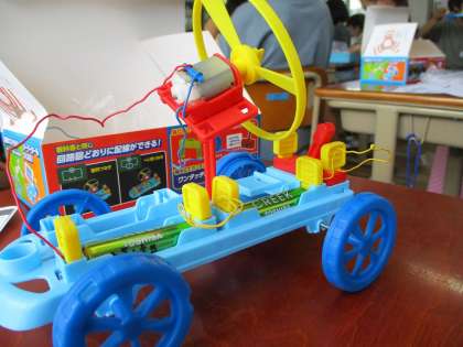 4年生の理科の交流学習で「電池のはたらき」について学習しています。今日は電池のはたらきを使った車づくりを行いました。