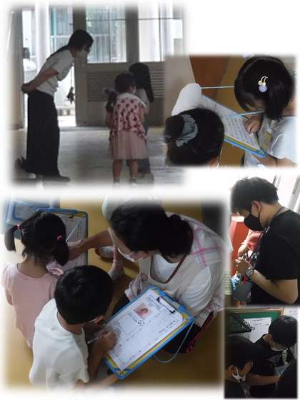 コンコンコン。ノックをします。(3回です)「しつれいします。」そして,自分の名前を言って,「いま おじかんいいですか?」……インタビューが始まります。とっても緊張しているようです。でも相手の名前や「どんなおしごとを していますか。」と質問した回答を一生懸命メモします。終わってからもメモを付け加えています。一仕事終えると教室へさっとかえっていきました。