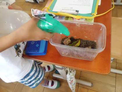 生活科で飼っている生き物の中には,残念ながら死んでしまったものもいました。その死が無駄にならないように,なぜ死んでしまったのか,どんな世話をしたらよかったのかを話し合いました。また,今飼っている生き物がもっと気持ちよく過ごせるように,自分たちにできることはないかを考えました。子どもたちは「もっと土を湿らせた方がいいかも。」「遊べるものを用意しよう。」「野菜をあげてみよう。」などと言って,取り組んでいました。