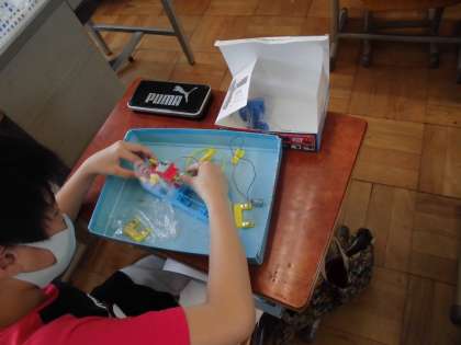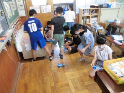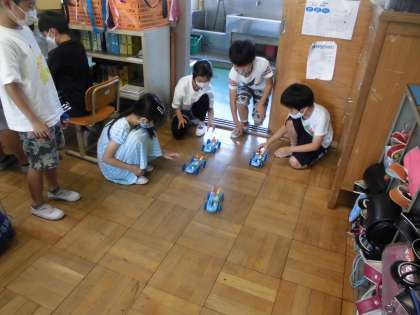 理科の授業で電池を使いモーターを回して車を走らせました。直列つなぎと並列つなぎでは走る速さが変わり,子どもたちは楽しんでいました。