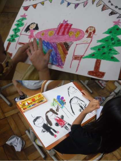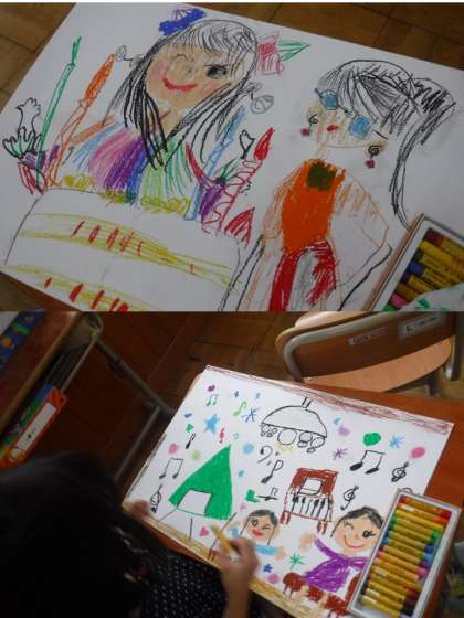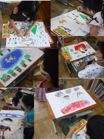 今までの楽しかった経験うれしかった経験を思い出します。そして,その出来事をみんなに伝える絵を描いていきます。自分の楽しかった出来事を思い出す時間は,楽しくて楽しくて仕方がありません。自分が話したくてお話がなかなか止まりません。思い出した後,クレヨンで描いていきます。一生懸命塗り込りこんだり丁寧に下書きをしたり様々です。「これは かぞくで おんせんに いったの。」と説明してくれます。最後にみんなに絵を見せながら,「どんなに楽しかったか」「どんなにうれしかったか」を発表します。素敵な絵がたくさんできました。2枚目に挑んでいる友だちもいました。
