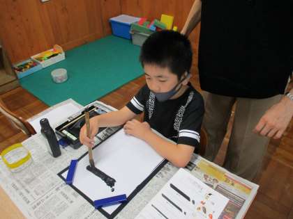 今日は始筆,送筆,終筆に気を付けながら「二」の文字を書きました。みんな力強い文字を書くことができました。