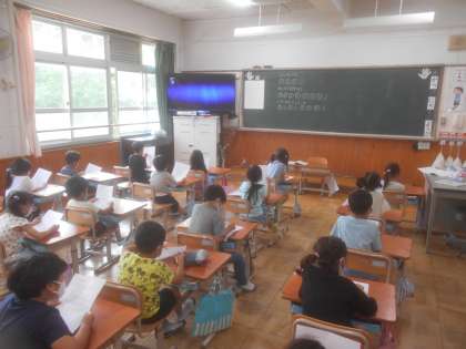 音楽の学習の時間にスマイルアゲインという曲を聴いています。