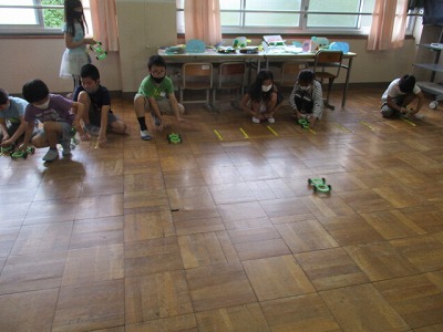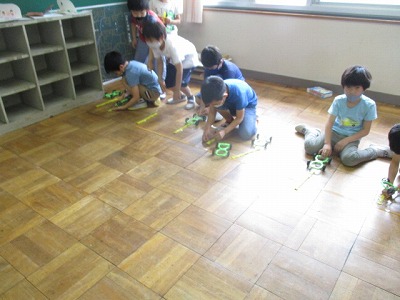 今日は,ゴムで走る車を組み立て,走らせてみました。