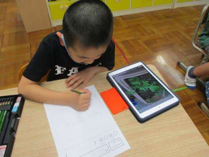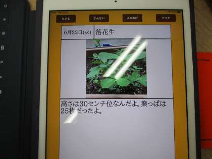 その後写真を見ながら観察カードに絵と文で落花生の様子を記録しました。最後にタブレットの絵日記アプリでも観察カードを書きました。