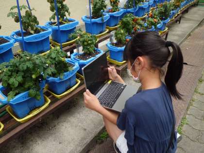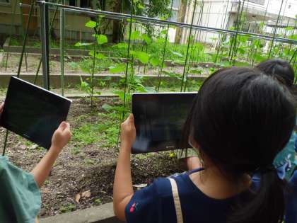タブレットを使い,トマトやきゅうりの写真を撮りました。