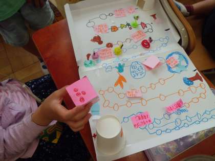 すごろくゲームが出来上がってきました。一度自分で遊んでみて,もっと工夫できることや改善点などを見つけ,さらに楽しいゲームになるように励んでいました。