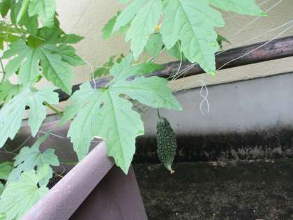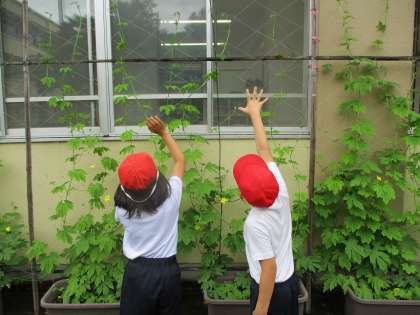 今日は4年生の理科で育てているツルレイシを観察しました。1週間ぶりに観察すると・・・何と小さなゴーヤができていました!つるは4年生の2人が手を伸ばしても届かない,遥か上の方まで伸びていました。