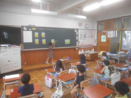 黒板に貼られているイラストを動かしたり,指をさしたりして一生懸命に説明し伝えようとしている姿がとても素敵だなと感じます。