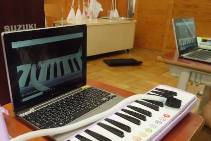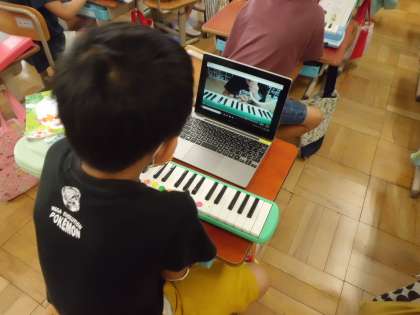 鍵盤ハーモニカで「かっこう」を吹きました。吹いている姿をGIGA端末で動画に撮り,自分の演奏を聞いて,よかったところや次に頑張るところを見つけて,練習に生かしていました。