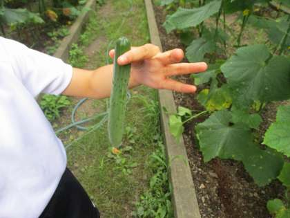 今日初めて4年生の畑できゅうりが収穫できました!先週は赤ちゃんみたいに小さかったきゅうりの実が,1週間でこんなに大きくなりました!植物の成長は早いです。