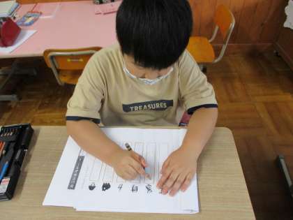 こすもす学級では夏休みに向けて毎日復習を頑張っています。夏休みの宿題もこすもす学級ではもちろん一人一人にあった課題です。そこで,落ち着いて夏休みの課題に取り組めるようにコツコツと練習を積んでいます。